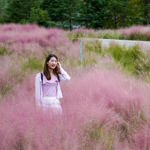 10月2日,游客穿行在疊石花谷景區內粉黛亂子草組成的粉色花海中。
