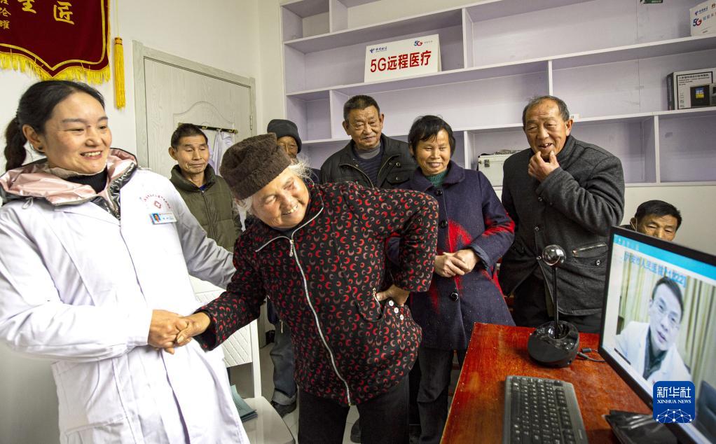 安徽省金寨縣大灣村村民方臨芳(前左二)指著(zhù)自己身體疼痛的部位,在村醫袁玲(左一)的幫助下向5G遠程醫療會(huì )診的專(zhuān)家講述病情(2020年12月3日攝)。