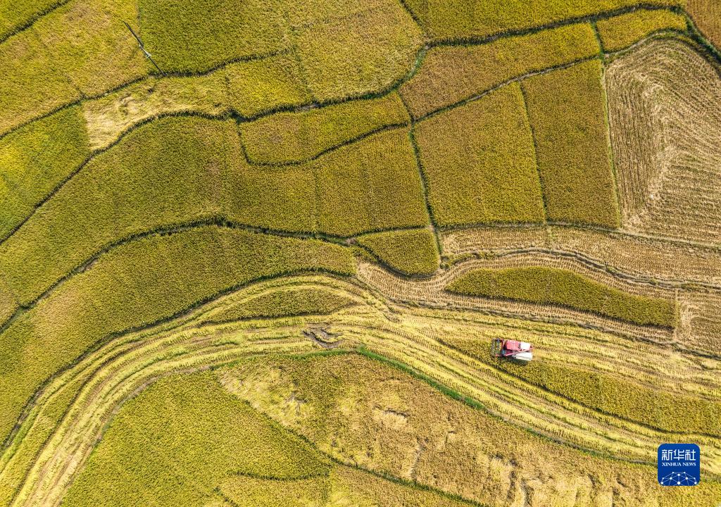 10月1日,農機手駕駛收割機在湖北省宜昌市秭歸縣九畹溪鎮石柱村田間收獲稻谷(無(wú)人機照片)。