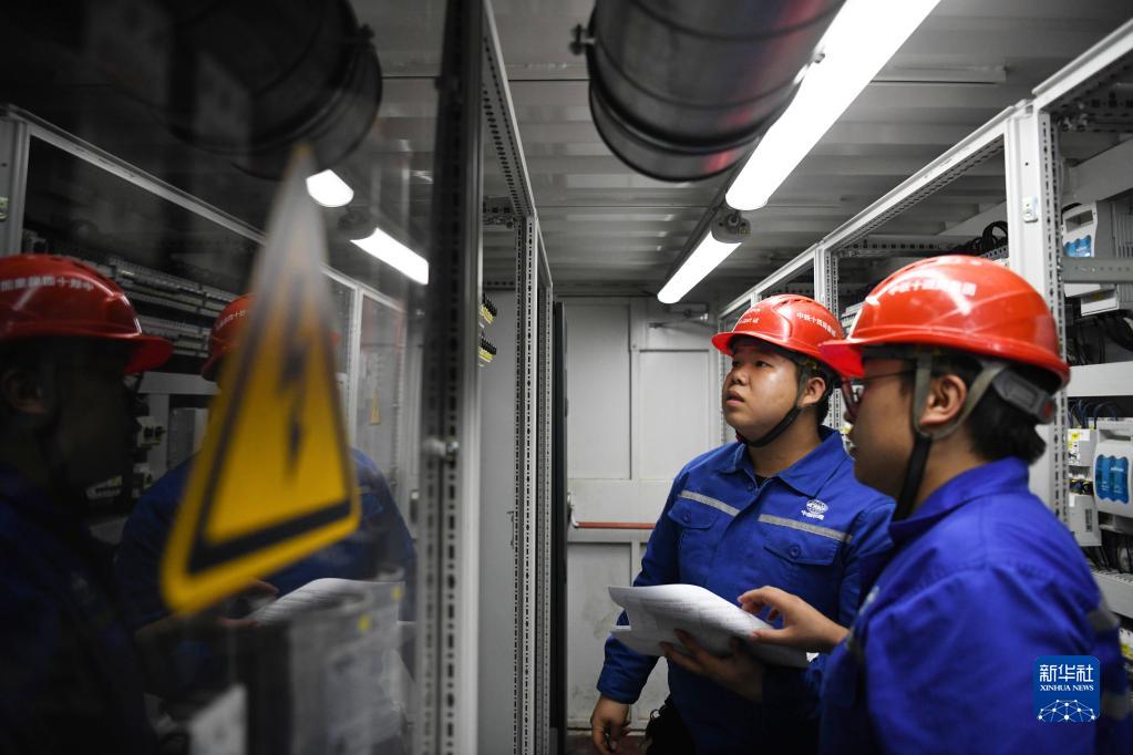 10月3日,在蕪湖城南過(guò)江隧道施工現場(chǎng),工作人員杜世?。ㄗ螅┖屯略谶M(jìn)行設備巡檢。