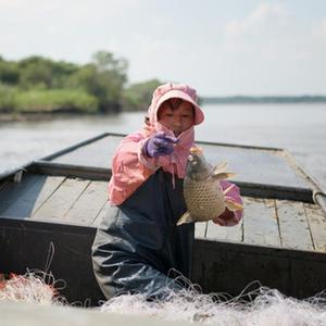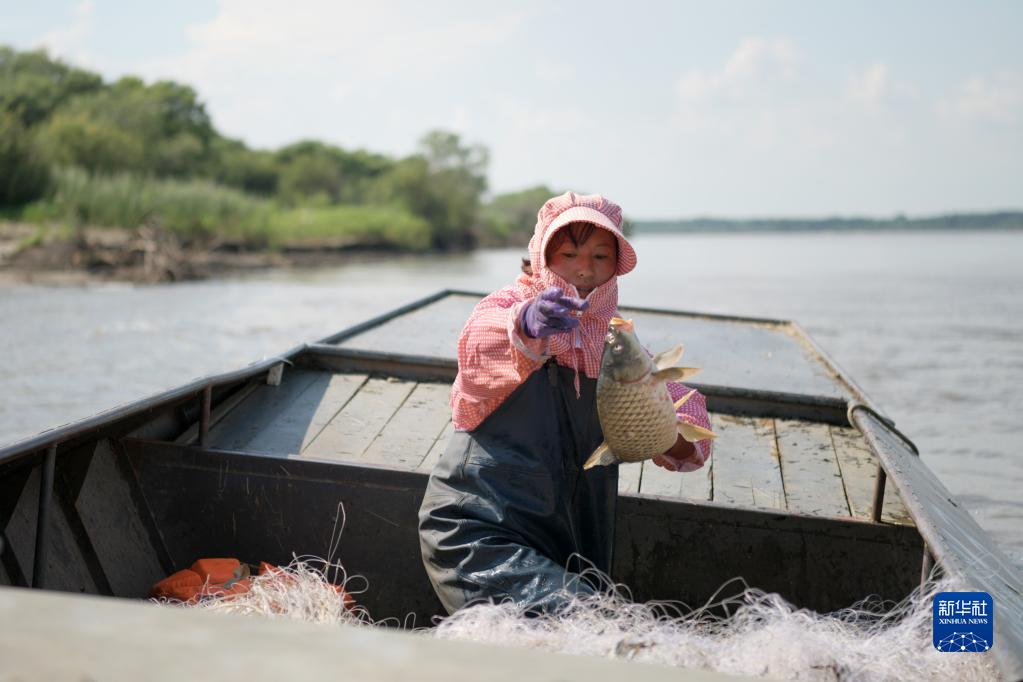 在黑龍江省同江市八岔赫哲族鄉八岔村二道江灘地,赫哲族村民叢秀松把剛打上來(lái)的魚(yú)扔進(jìn)船艙(2020年7月22日攝)。