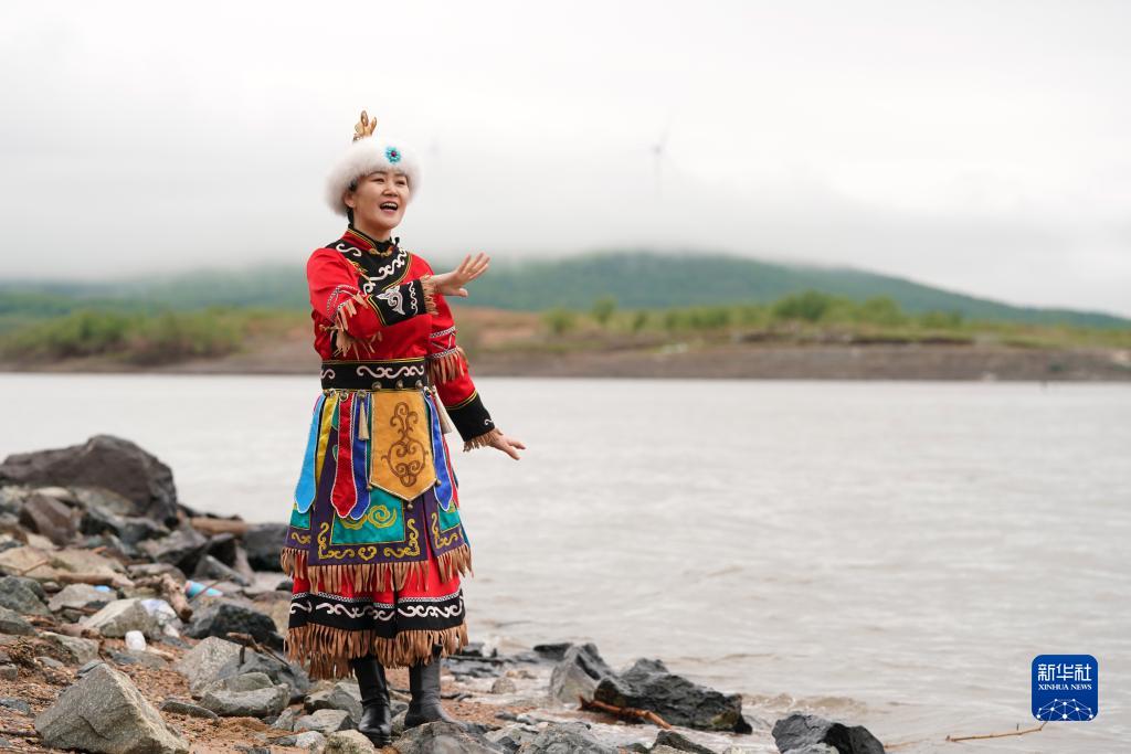 在黑龍江省同江市街津口赫哲族鄉漁業(yè)村,赫哲人劉蕾展示一段赫哲族歌舞(2022年5月21日攝)。