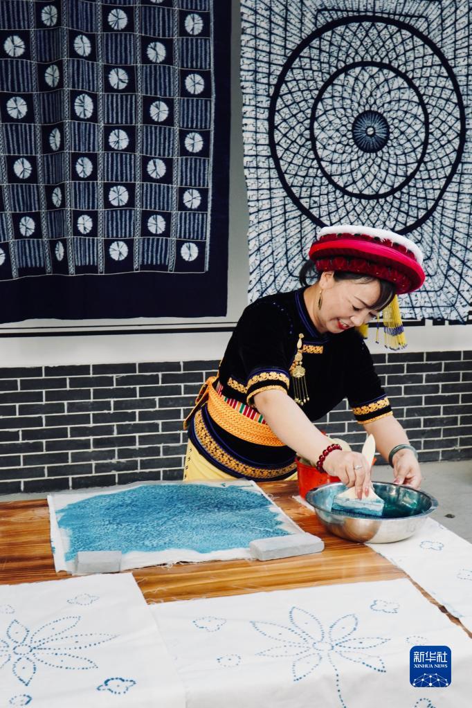 在湖南省桑植縣芙蓉橋白族鄉合群村,張丕和展示白族扎染技藝(9月8日攝)。