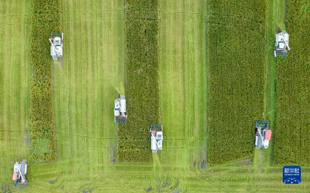 10月3日,在江蘇省海安市,農民在駕駛機械收割水稻(無(wú)人機照片)。