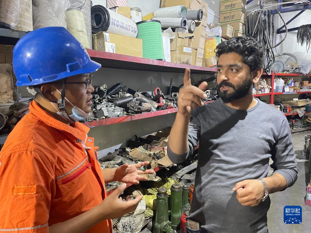 10月2日,在巴基斯坦西北部開(kāi)伯爾-普什圖省曼塞赫拉地區,中國能建葛洲壩集團第三工程有限公司蘇吉吉納里水電站項目管理人員周濤(左)在水電站設備修理車(chē)間檢查設備情況。
