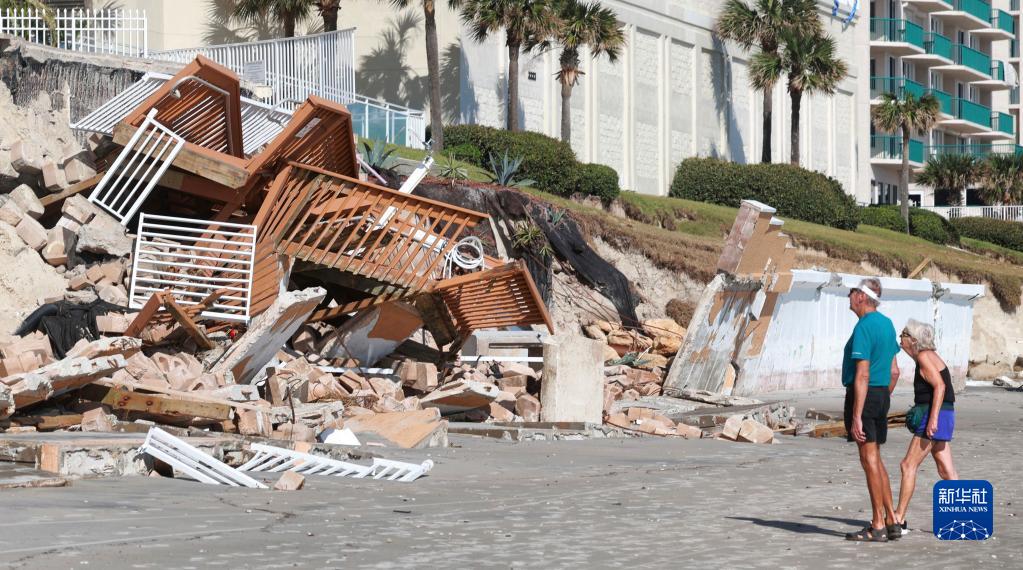 10月3日,在美國佛羅里達州代托納比奇海灘,人們查看遭颶風(fēng)“伊恩”損毀的設施。