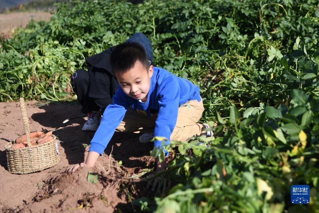 10月4日,小朋友在甘肅省蘭州市石佛溝一處露營(yíng)地體驗采摘。