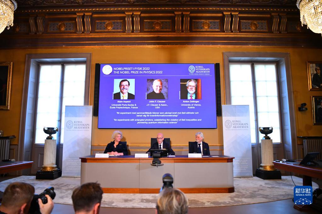 這是10月4日在瑞典斯德哥爾摩拍攝的2022年諾貝爾物理學(xué)獎公布現場(chǎng)。
