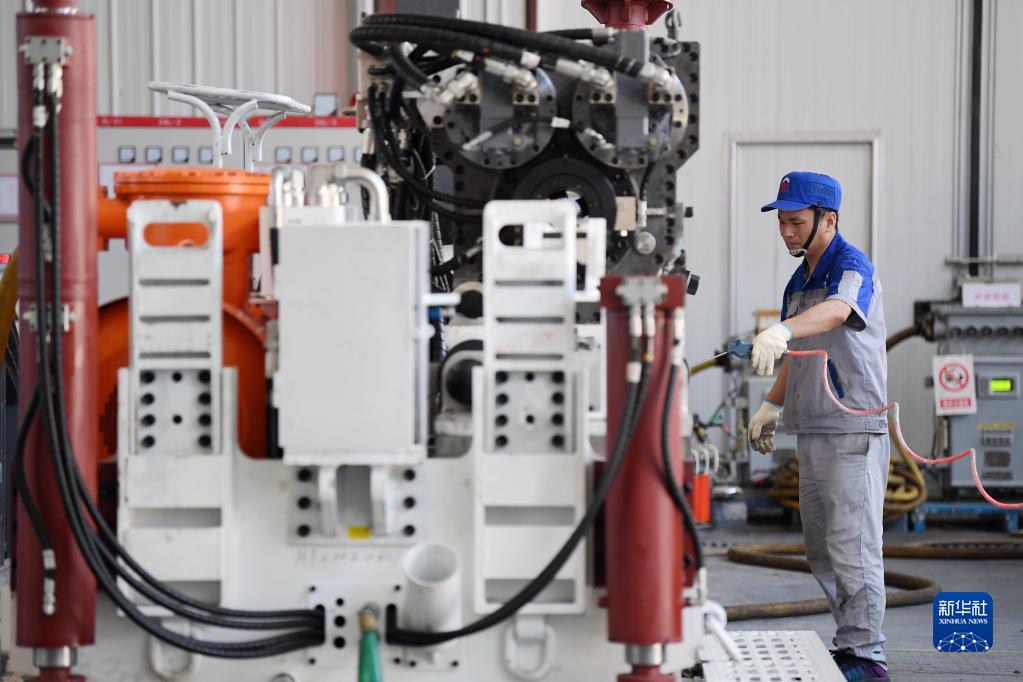 在位于秦創(chuàng )原總窗口所在地陜西省西咸新區的陜西太合智能鉆探有限公司,工人準備對智能定向鉆機進(jìn)行性能調試(2022年6月17日攝)。新華社記者 李一博 攝