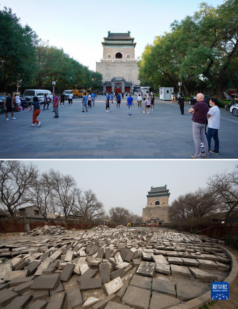 這是一張拼版照片:上圖為2022年9月18日,市民在北京鐘鼓樓廣場(chǎng)上休閑健身。鐘鼓樓區域經(jīng)整治后成為了市民文化生活的重要場(chǎng)所(新華社記者陳鐘昊攝);下圖為2014年3月25日,北京鐘鼓樓廣場(chǎng)地面進(jìn)行大修(資料照片,李慧攝)。 新華社發(fā)