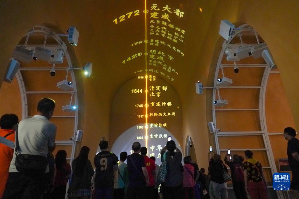 2022年8月28日,觀(guān)眾在北京鼓樓一層觀(guān)看“時(shí)間的故事”展覽中的光影秀。2019年11月,北京啟動(dòng)鼓樓保護展示工程,經(jīng)過(guò)騰退修繕,這里恢復了券洞歷史風(fēng)貌,成為向公眾開(kāi)放、展示鐘鼓樓歷史文化的文化空間。 新華社記者 陳鐘昊 攝