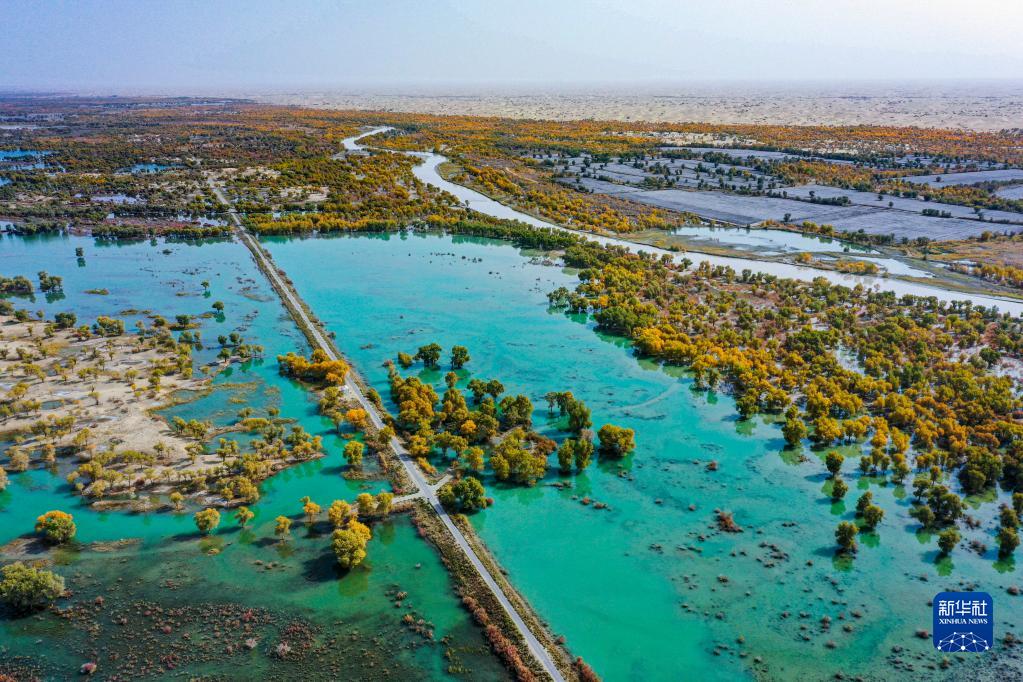 這是2020年10月12日拍攝的胡楊林區景色(無(wú)人機照片)。