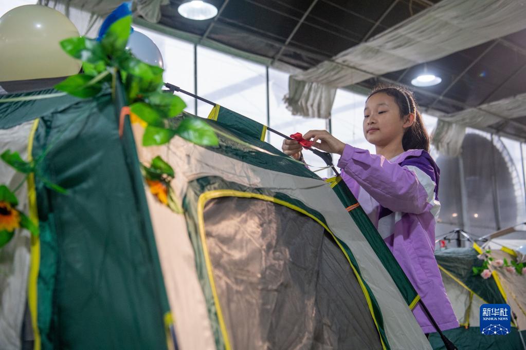10月5日,在天華百卉園內,小朋友在布置帳篷。