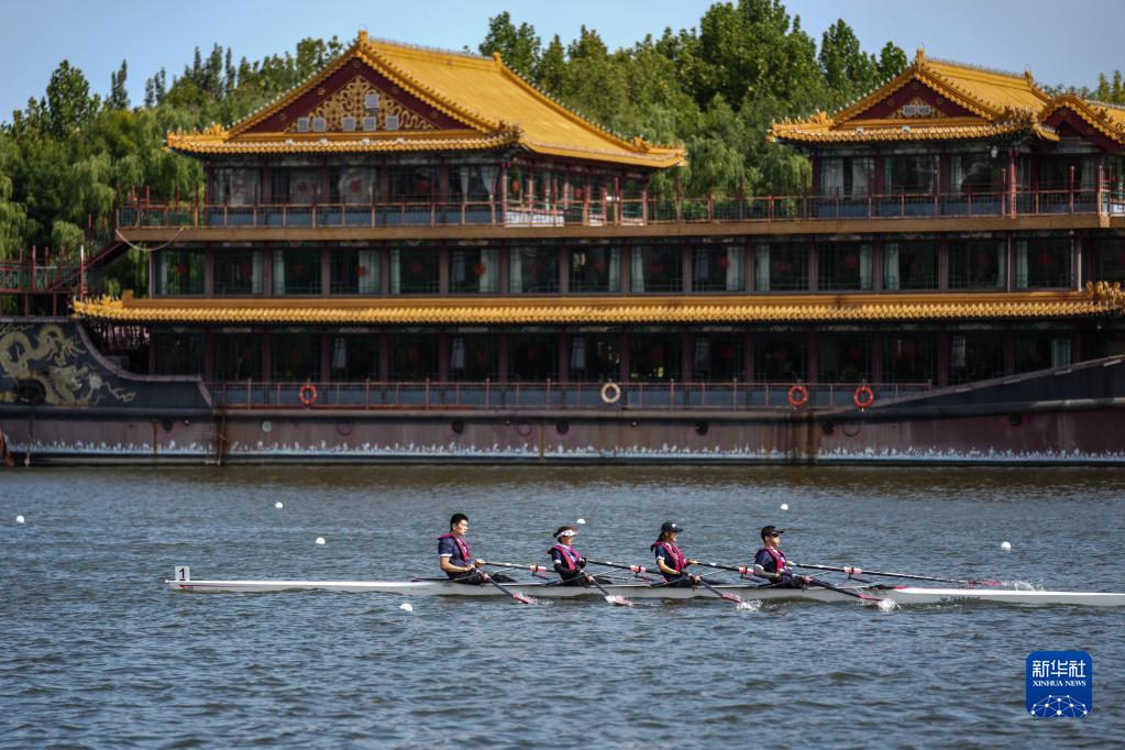 市民在位于北京市通州區的京杭大運河上進(jìn)行賽艇比賽(2022年9月18日攝)。