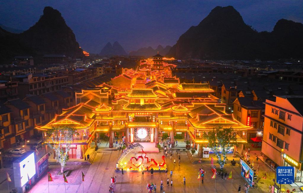 10月5日拍攝的湖南省永州市江華瑤族自治縣水口鎮瑤都水街夜景(無(wú)人機照片)。