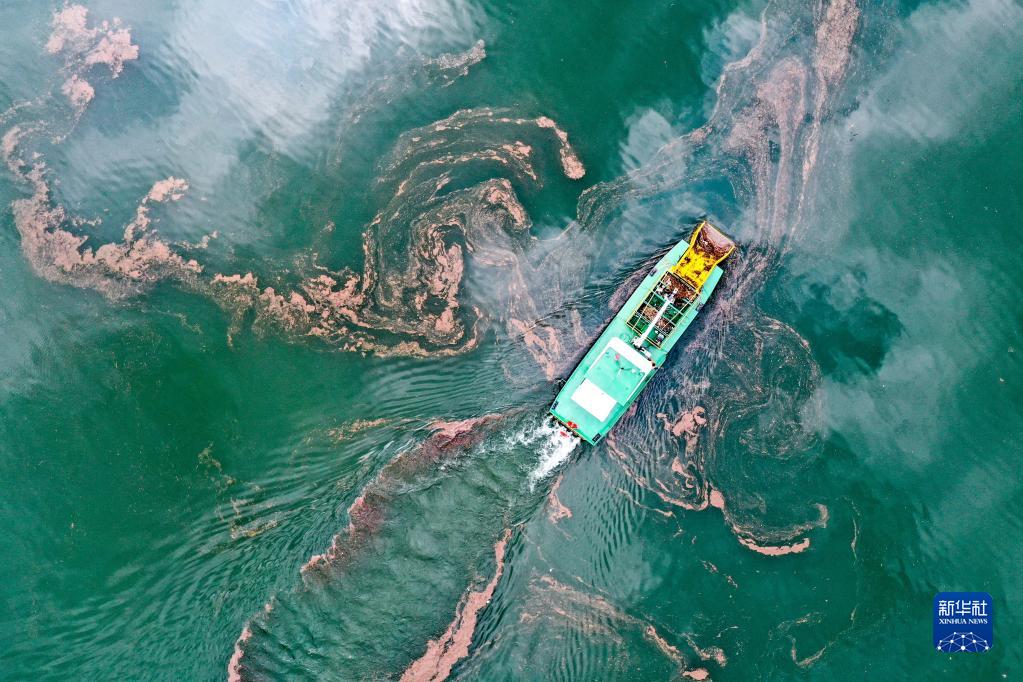 垃圾清理船在貴州省黔西市烏江源百里畫(huà)廊江面上清理垃圾(2022年6月2日攝)。新華社記者 歐東衢 攝