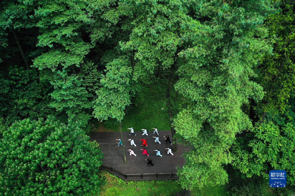 市民在貴陽(yáng)市長(cháng)坡嶺國家級森林公園里健身(2022年7月13日攝,無(wú)人機照片)。新華社記者 楊文斌 攝