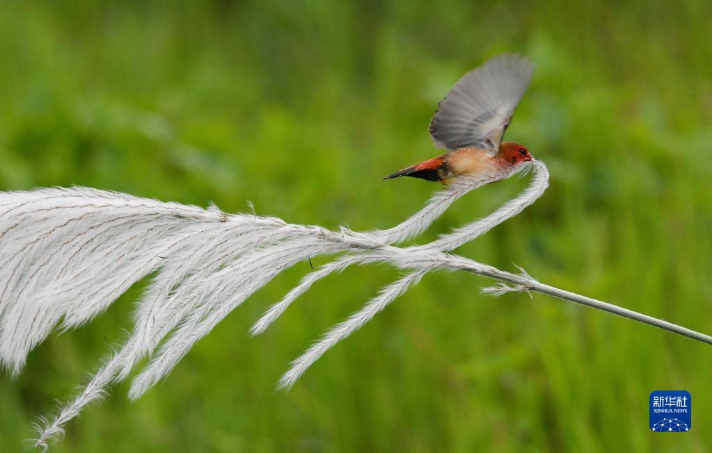 在云南省景洪市的山野間,紅梅花雀采集蘆花用來(lái)筑巢(9月25日攝)。