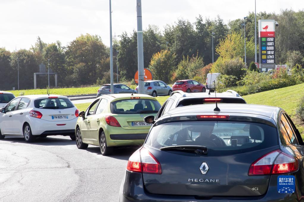 10月6日,在法國北部城市里爾,歐尚超市的加油站前車(chē)輛排起長(cháng)隊。近日,法國道達爾集團旗下的許多加油站因燃油供應中斷而暫時(shí)關(guān)閉,導致其他加油站前排起長(cháng)龍。