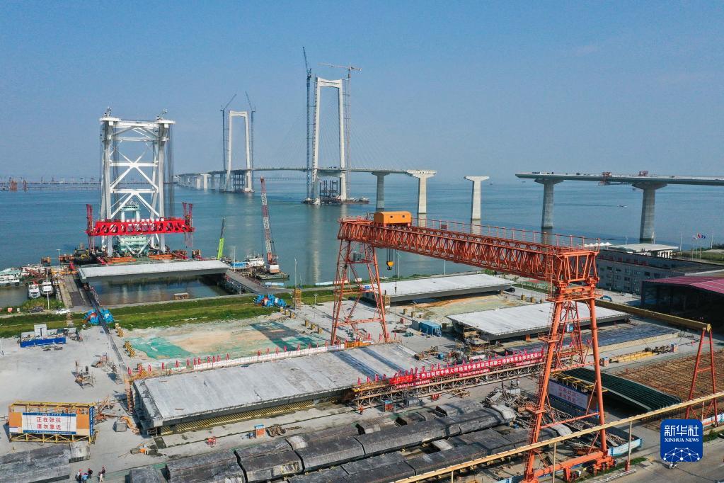 10月8日,深中通道中山智慧梁場(chǎng)的第155片60米混凝土箱梁完成預制(無(wú)人機照片)。新華社記者 劉大偉 攝