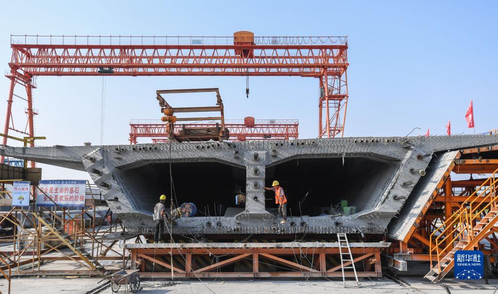 10月8日,施工人員在中山智慧梁場(chǎng)的第155片60米混凝土箱梁上進(jìn)行隔墻作業(yè)。新華社記者 劉大偉 攝