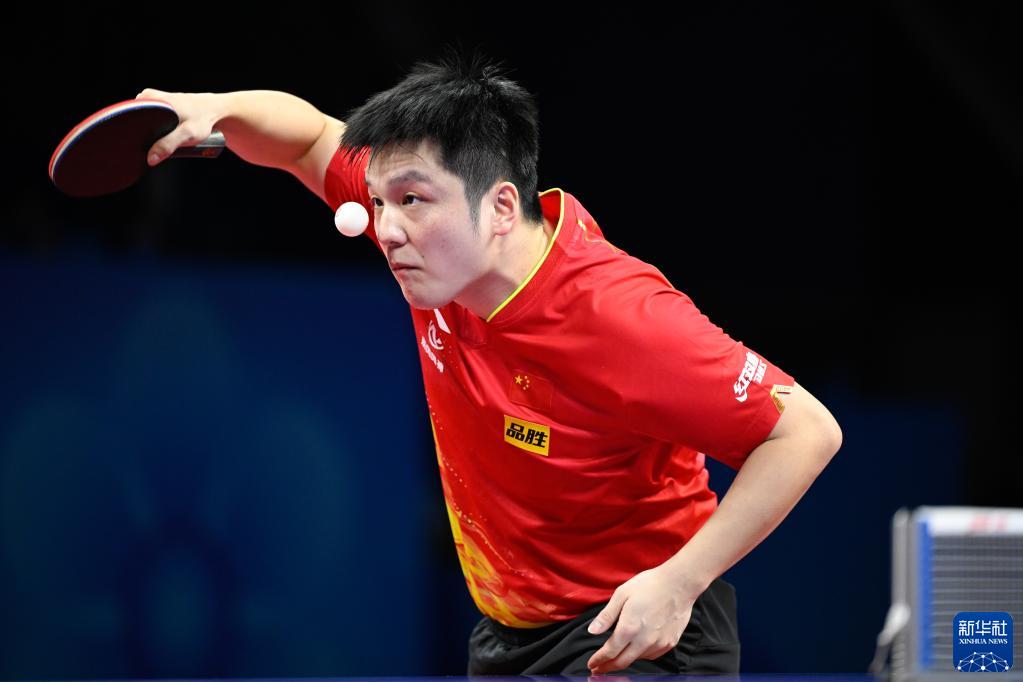 10月8日,中國隊選手樊振東在比賽中發(fā)球,他以3比0戰勝日本隊選手戶(hù)上隼輔。