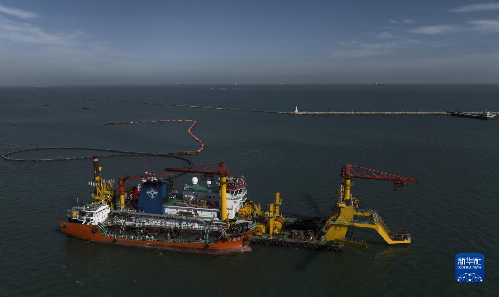 10月8日,施工船在唐山港京唐港區第四港池25萬(wàn)噸級航道工程建設工地施工(無(wú)人機照片)。新華社記者 楊世堯 攝