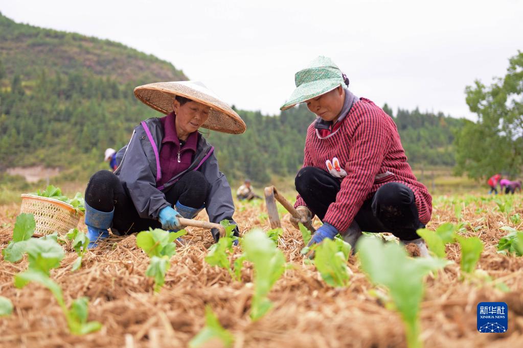 10月8日,村民在貴州省黔東南苗族侗族自治州岑鞏縣羊橋土家族鄉祝壩村移栽芥菜苗。新華社發(fā)(唐鵬 攝)