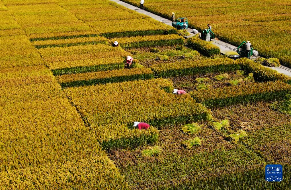 10月8日,在位于江蘇省揚州市的江蘇里下河地區農業(yè)科學(xué)研究所,農民在試驗田里收割水稻(無(wú)人機照片)。新華社發(fā)(孟德龍 攝)