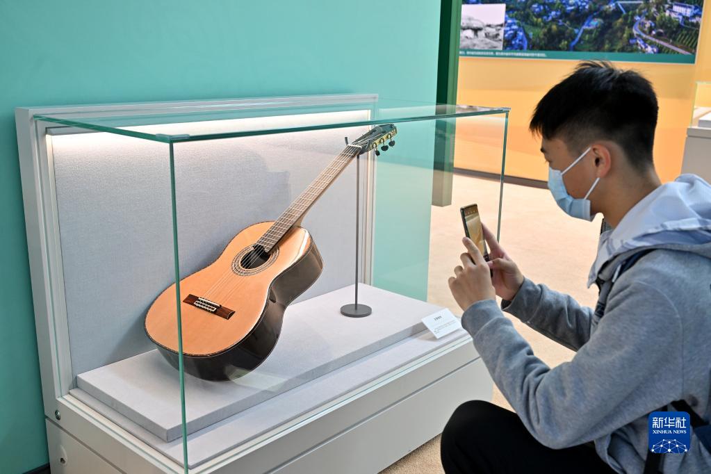 10月8日,一名觀(guān)眾在貴州展區拍攝正安吉他。貴州省正安縣目前已成為全球最大吉他生產(chǎn)基地,已帶動(dòng)近15000人在家門(mén)口就業(yè)、6000余人穩定脫貧。新華社記者 李鑫 攝