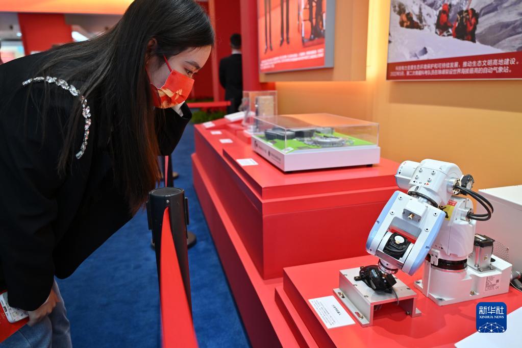 10月8日,一名觀(guān)眾在中央綜合展區內觀(guān)看六關(guān)節機器人測試鼠標壽命。六關(guān)節機器人是全球首款3kg負載高精度掌上六軸工業(yè)機器人,解決了關(guān)節機器人低速抖動(dòng)的關(guān)鍵難點(diǎn)。新華社記者 李鑫 攝
