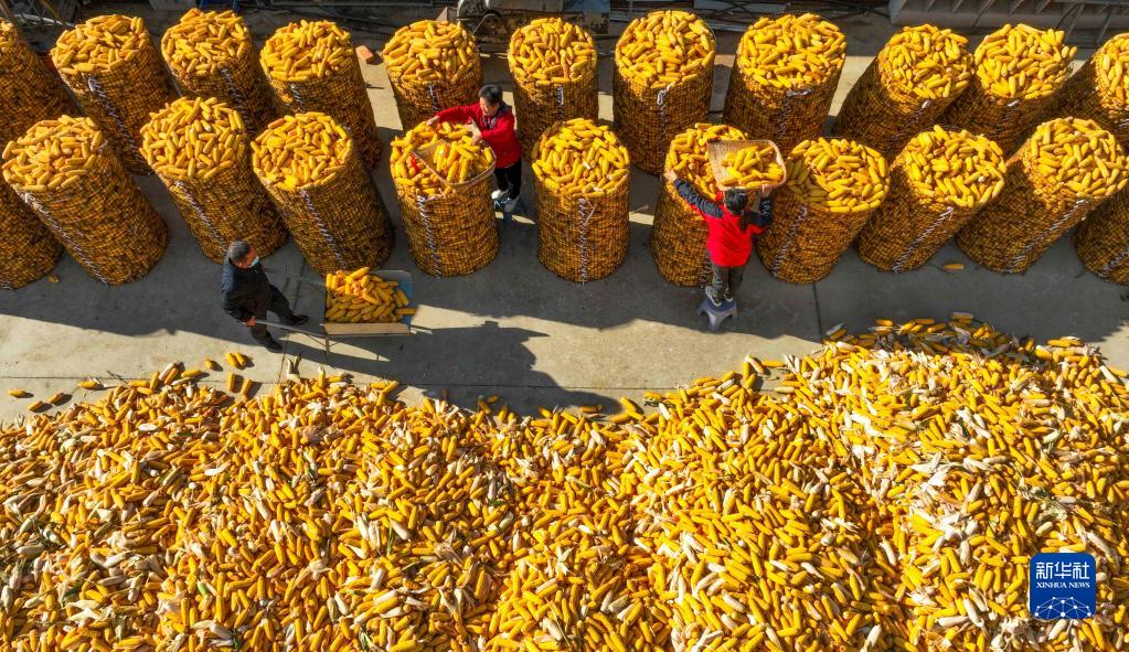 10月9日,河北省遵化市劉備寨鄉農民將收獲的玉米裝入糧囤(無(wú)人機照片)。