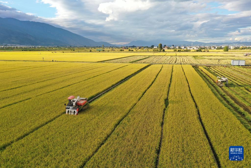 10月8日,工作人員在云南省大理市灣橋鎮水稻綠色種植基地收割水稻(無(wú)人機照片)。