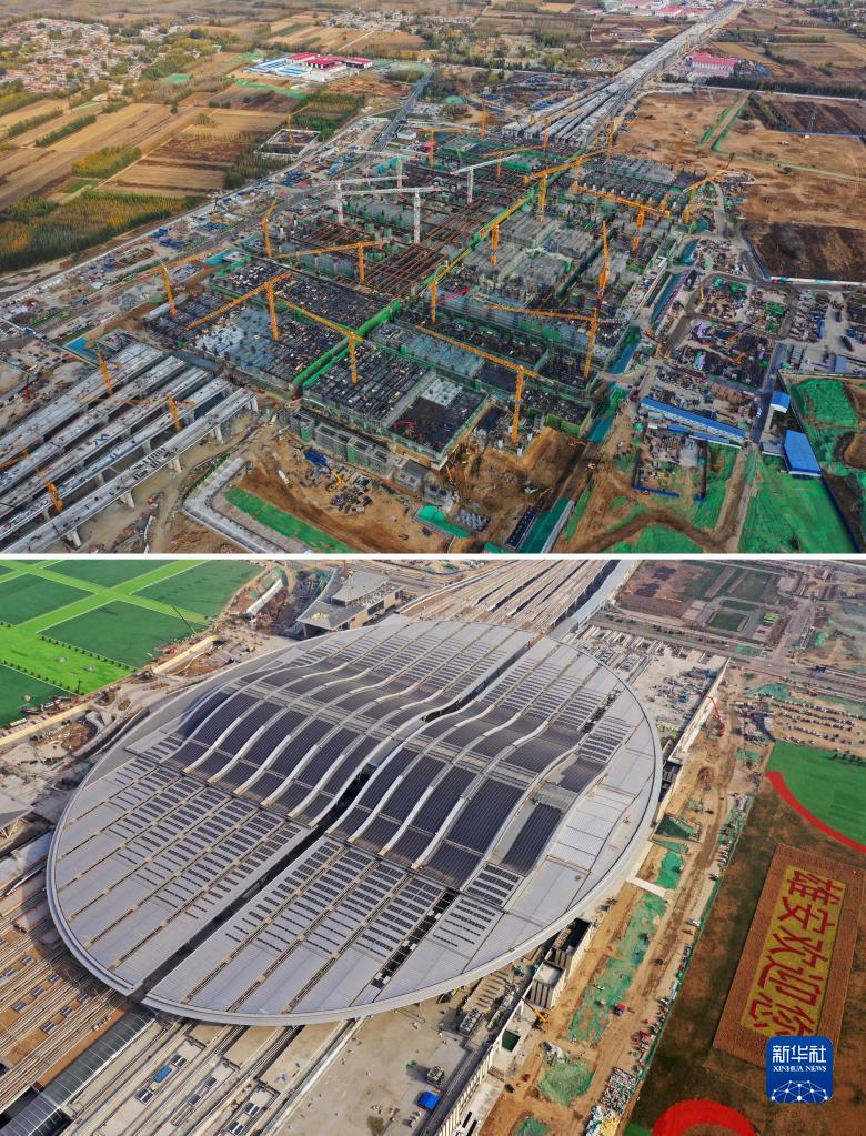 拼版照片:上圖為建設中的雄安站(無(wú)人機照片,2019年11月7日攝);下圖為建成的雄安站(無(wú)人機照片,2021年4月1日攝)。