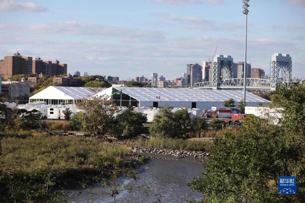 這是10月9日在美國紐約市蘭德?tīng)枍u拍攝的建設中的移民救援中心。
