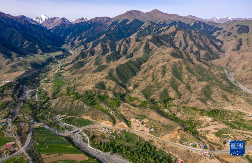 新疆吉木薩爾縣新地鄉的一處伴山鄉間公路(2022年5月22日攝,無(wú)人機照片)。路旁的小分子村發(fā)展鄉村旅游,成為遠近聞名的“畫(huà)家村”。