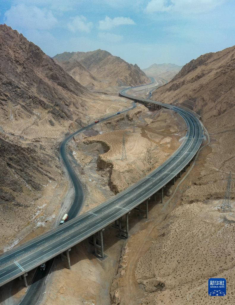 新疆依吞布拉克至若羌高速公路穿越阿爾金山(2022年5月9日攝,無(wú)人機照片)。