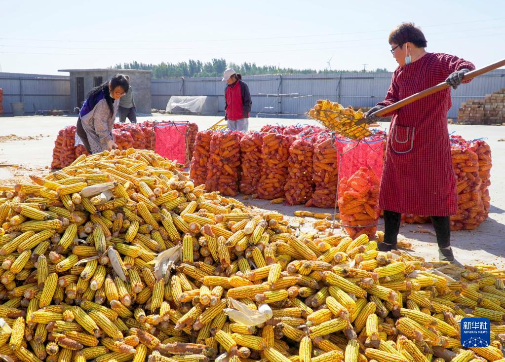 10月10日,在山東省菏澤市定陶區黃店鎮,村民將收獲的玉米進(jìn)行晾曬。