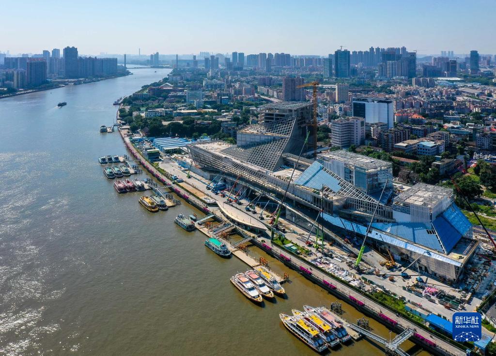 廣東美術(shù)館、廣東非物質(zhì)文化遺產(chǎn)展示中心、廣東文學(xué)館“三館合一”建筑長(cháng)350米,高近80米,宛如一艘“文化巨輪”揚帆珠江(10月12日攝,無(wú)人機照片)。