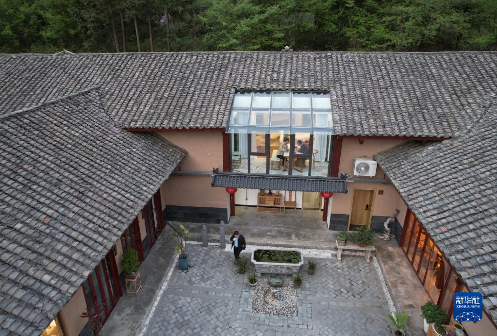 游客在陜西佛坪縣西岔河鎮銀廠(chǎng)溝村一家民宿內休閑(2022年4月19日攝,無(wú)人機照片)。