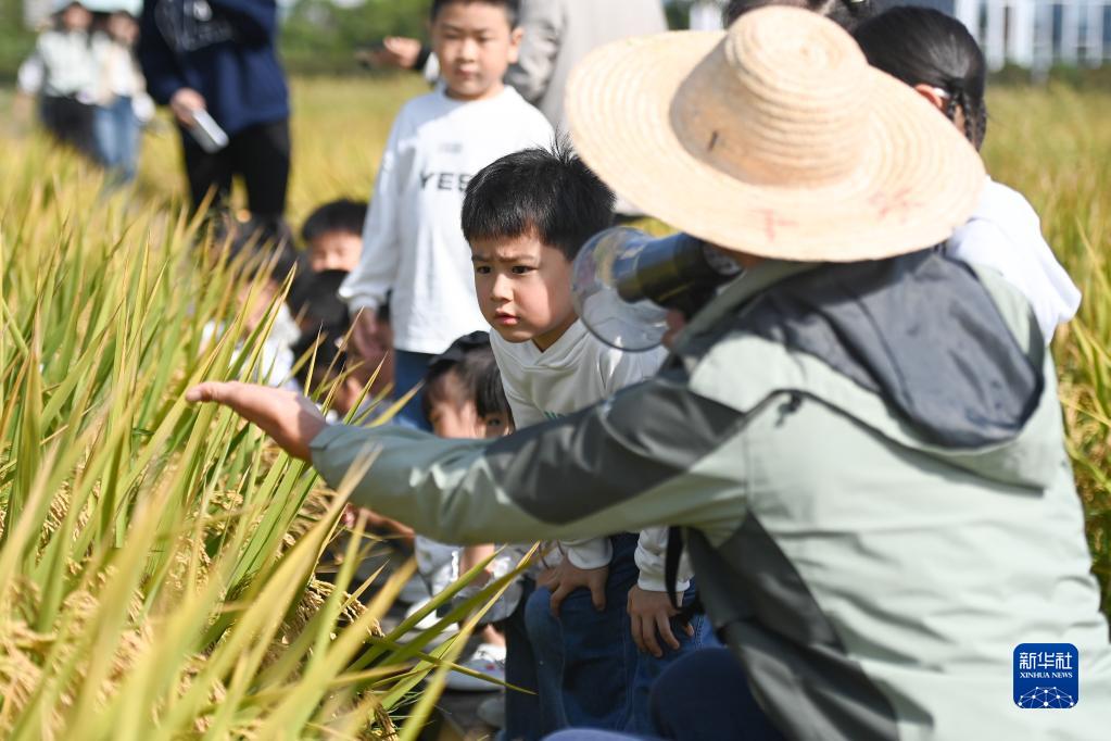 10月14日,浙江省湖州市吳興高新區靈糧農場(chǎng)的農技人員在稻田邊向小朋友介紹種糧知識。