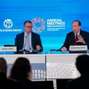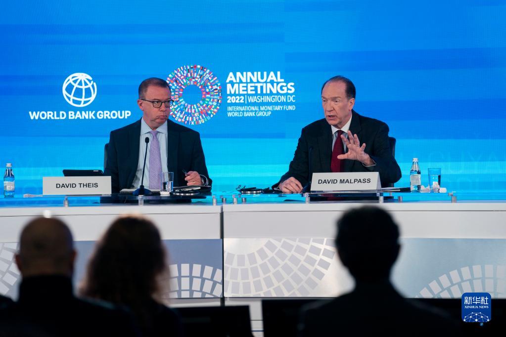 10月13日,在美國首都華盛頓,世界銀行行長(cháng)馬爾帕斯(右)在記者會(huì )上發(fā)言。