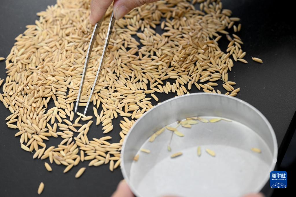 10月13日,在中央儲備糧合肥直屬庫有限公司本部,工作人員對等待入庫的稻谷進(jìn)行檢測。