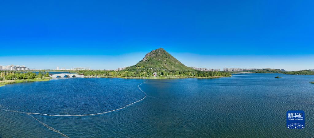 這是10月9日在山東省濟南市拍攝的晴空下的華山景區(無(wú)人機全景照片)。