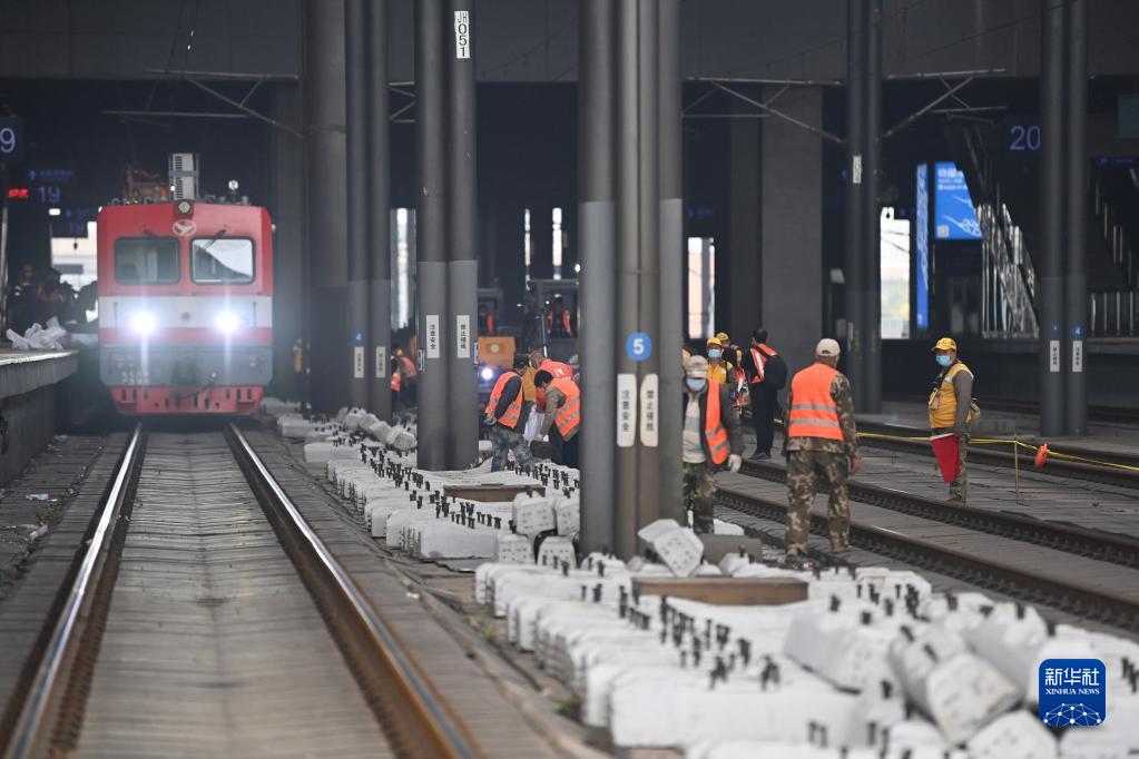 10月14日在天津西站拍攝的換枕施工現場(chǎng)。