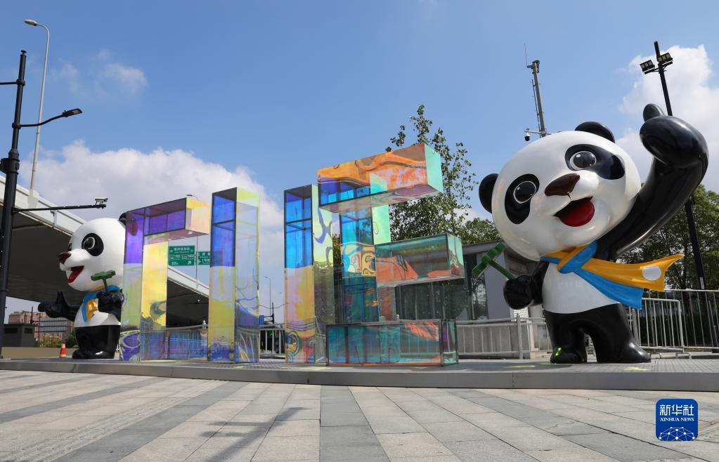 這是國家會(huì )展中心(上海)北入口外的進(jìn)博主題裝飾(10月15日攝)。