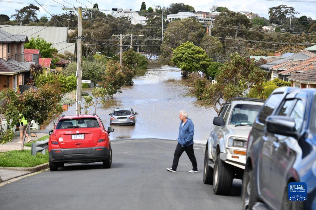 這是10月14日在澳大利亞維多利亞州拍攝的被洪水淹沒(méi)的街道。