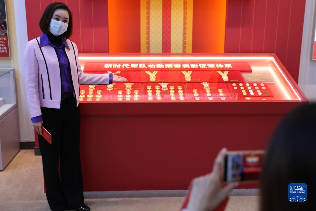 觀(guān)眾在“奮進(jìn)新時(shí)代”主題成就展第八單元“堅持走中國特色強軍之路 全面推進(jìn)國防和軍隊現代化”展廳與新時(shí)代軍隊功勛榮譽(yù)表彰證章合影(10月12日攝)。新華社記者 許雅楠 攝