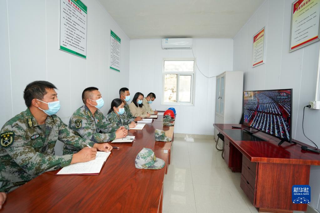 10月16日,在江蘇省連云港市灌云縣開(kāi)山島民兵哨所,名譽(yù)所長(cháng)王仕花(左三)、輪值民兵和江蘇電力開(kāi)山島黨員服務(wù)隊隊員在收看中國共產(chǎn)黨第二十次全國代表大會(huì )開(kāi)幕會(huì )。
