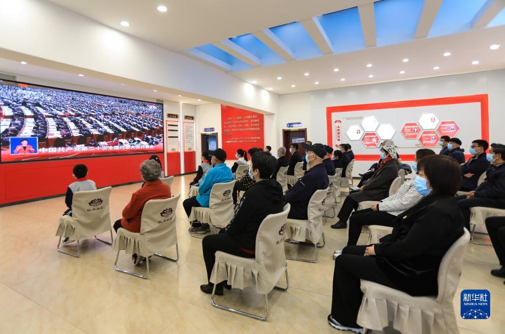 10月16日,在遼寧省沈陽(yáng)市皇姑區三臺子街道牡丹社區黨群服務(wù)中心,居民和沈陽(yáng)市皇姑區航空實(shí)驗小學(xué)的少先隊員收看中國共產(chǎn)黨第二十次全國代表大會(huì )開(kāi)幕會(huì )。